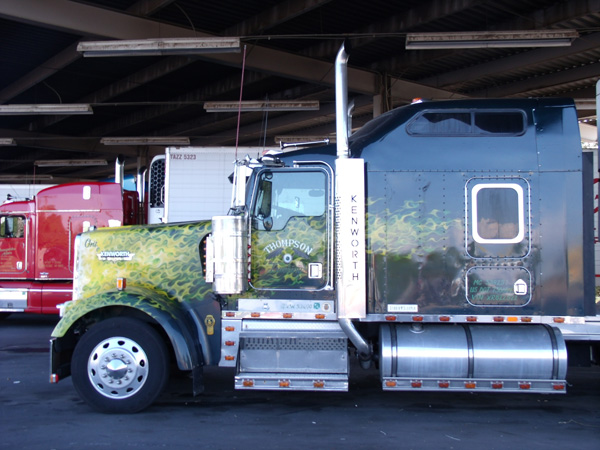 Custom paint, 7″ chino hay hauler stacks with Pickett elbows,550 CAT 18spd, Double rounds with JJ brackets, stainless steps, stainless belly pans, Half fenders, Rockwood